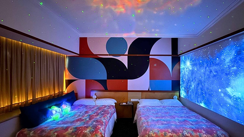 スターライト シネマティック ルームは、思い出に残る映画ナイトを過ごせるテーマルーム。没入型の部屋は、映画や物語、星空のひとときを家族で楽しむためにデザインされた居心地の良い空間です。テーマ ルームには、お子様向けのアメニティ、ゲーム コンソール、二段ベッド (シングルとクイーン)、引き出し式ベッド、小さな踏み台などの家具が備え付けられています。