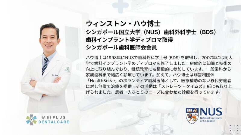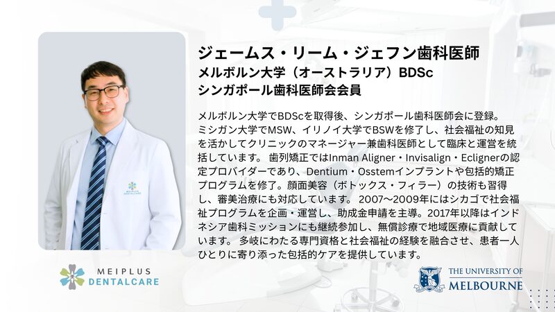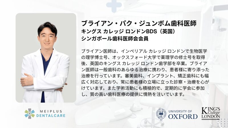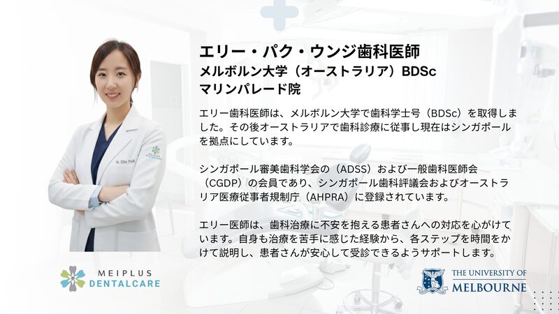 韓国人歯科医が在籍するMeiplus Dentalcare Marine Paradeで受けることができ、複雑な症例ではMedisave(医療費補助)の適用も可能です。