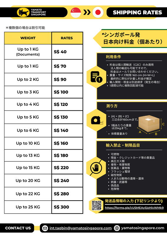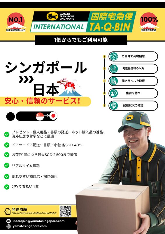 これまで日本に荷物を送る機会がなかった方も、この機会にぜひシンガポールヤマト運輸の国際宅急便をご利用ください!