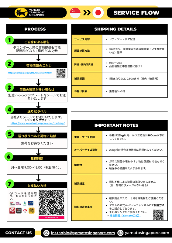 | Yamato Transport (S)(シンガポールヤマト運輸) お問い合わせ:int.taqbin@yamatosingapore.com(日本語可) 営業時間:月〜金 9:00-18:00 定休日:土日祝 WEBサイト ▶申し込みはこちらから。 |