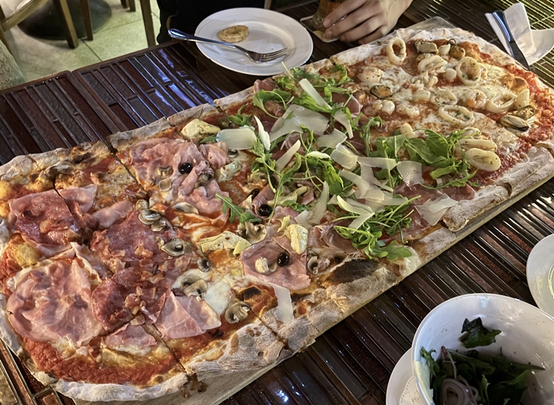 特にF1シーズンには、熱気あふれる観戦スポットとして大人気です。メニューには、カルボナーラやシーフード リングイネなどの自家製パスタに加え、人気のピザも揃っています。