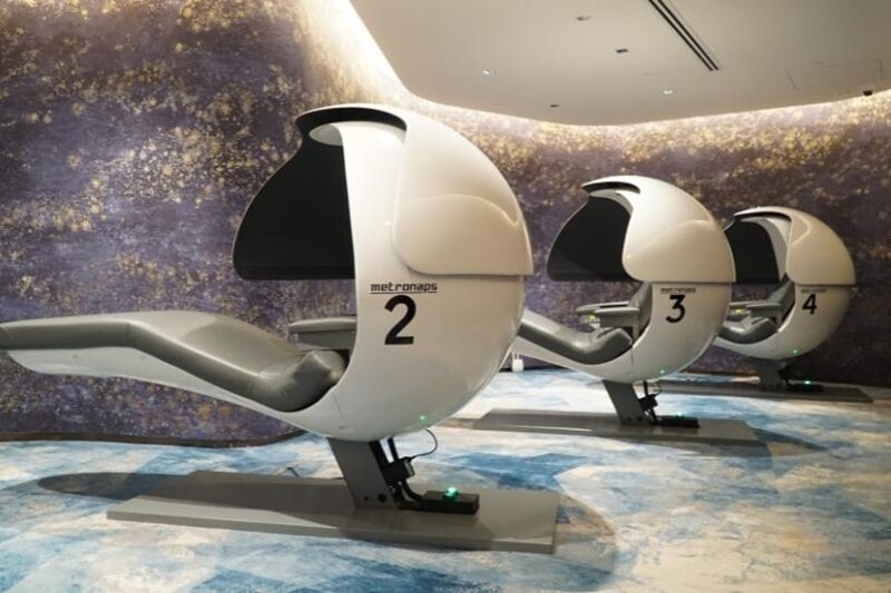 ここにはユニークなNap Podがあります。高度な技術が内蔵されており、光、音楽や振動を組み合わせた機能で、安眠後さわやかに目覚めることができます。1時間単位での利用が可能です。