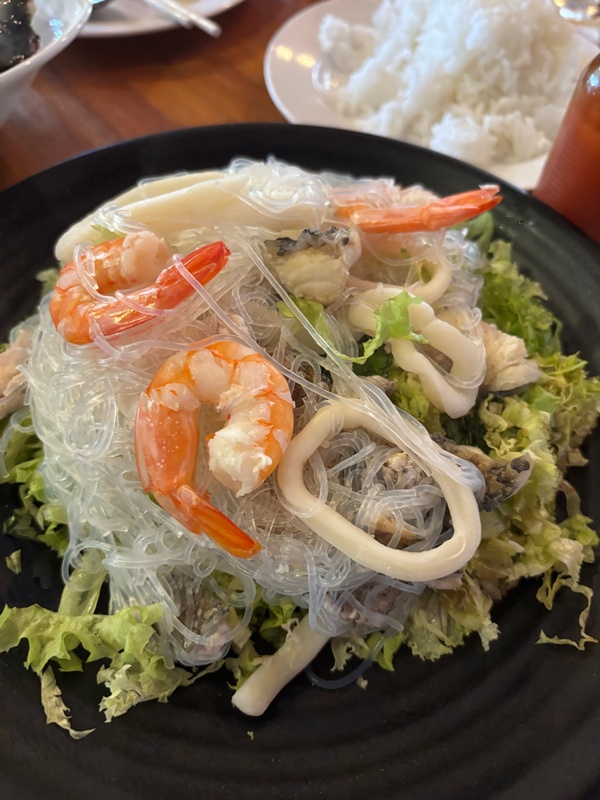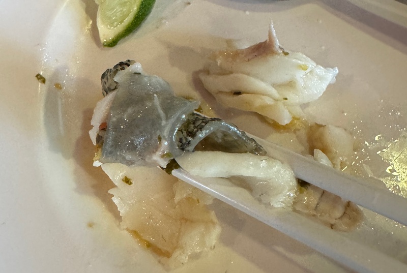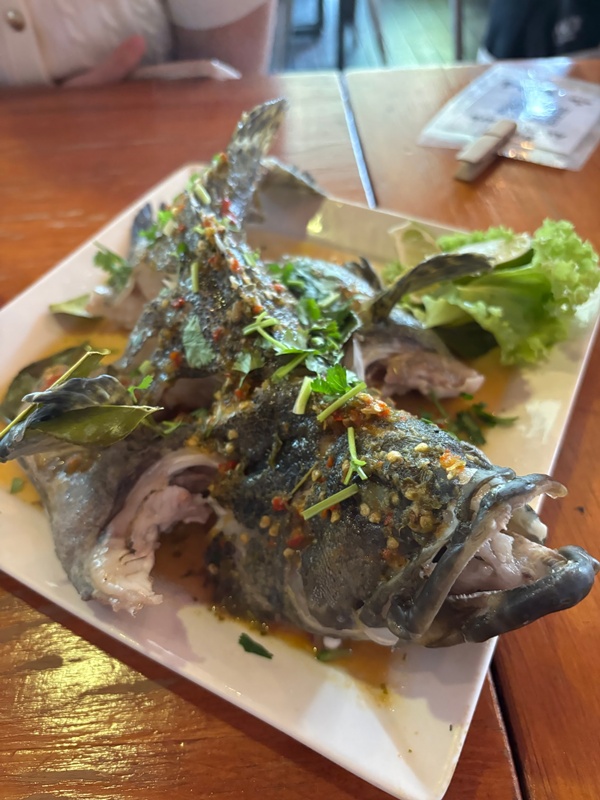 せっかくハタを釣ったので、1番人気のレモン蒸しにしました。香菜やタイバジル、ニンニクやチリ、ライムリーフやライムジュースが入ったソースは別添えもできます。少しスパイシーなので、お子さんがいる場合は、まずは取り分けてから、たっぷりとソースをかけて召し上がればいいですね。