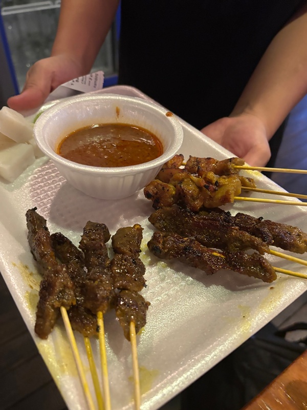 Bistro At The Parkでは、焼きたてのサテが楽しめます。香ばしく焼き上げられた肉をソースと一緒に味わう。屋外席でビールと一緒に楽しむのにぴったりです。