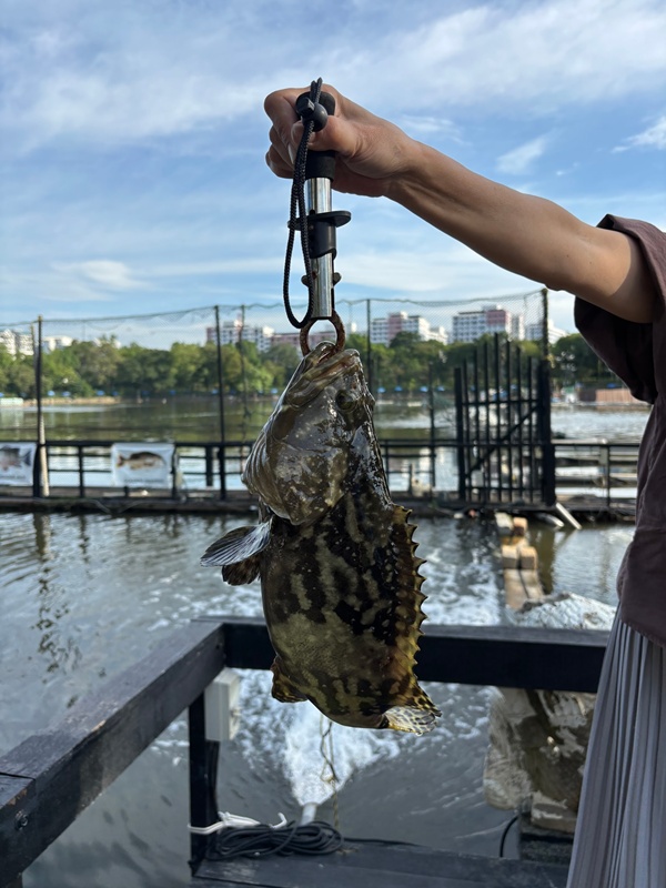 見ていると釣り堀は、ほぼ入れ食い状態。簡単にエサに食いついてくるようです。SingaLifeはどれにするか迷いましたが、蒸すと抜群のハタに挑戦。遠目に投げてゆらゆらしていたら、ぐぐっと引っ張られます。