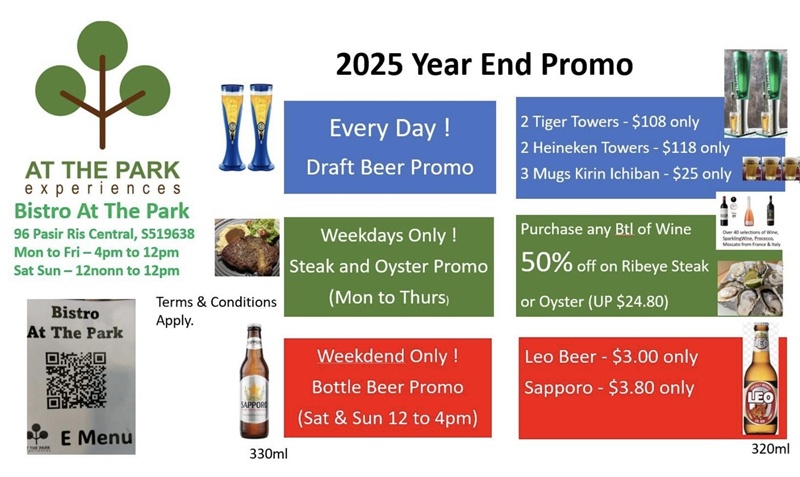 Pasir Ris Town Park にある「Bistro At The Park」なら、そんな楽しみがすべてここで完結!本格タイ料理をはじめ、アジア各国の味や洋食メニューも豊富にそろい、ビールやワインはもちろん、スピリッツ、ウィスキー、Sojuまで、好みに合わせてリーズナブルに楽しめます。