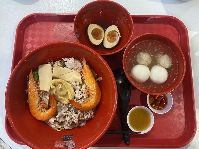 魚のすり身のお団子(フィッシュボール)と野菜、魚の切り身が入った麺料理です。透き通ったスープは優しい味で、ぷりぷりの魚のすり身団子はやみつきになる食感。ドライかスープを選ぶこともでき、ドライは麺とスープが別々のお椀に分かれていて絡めて食べる油そば風。