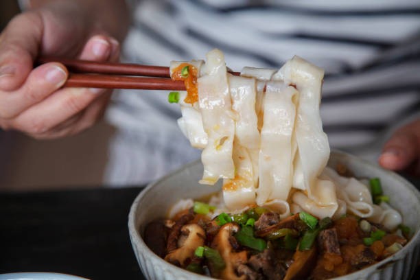 幅広のクイティアオ麺(Kway Teow)はややちぢれたきしめんのような米粉の麺で、牛肉麺(ビーフヌードル)などとの相性が良い麺となっています。
