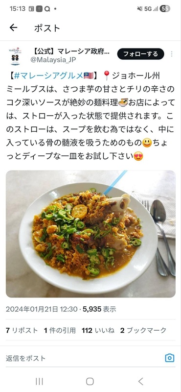 ミーレブスは、スパイシーなカレー風味のスープに麺が入った料理で、通常はゆで卵や豆腐がトッピングされます。とろっとしたソースの見た目と、カレーのような香りが食欲を刺激するミーレブスは、ふと食べたくなるのも納得のシンガポールのストリートフード。