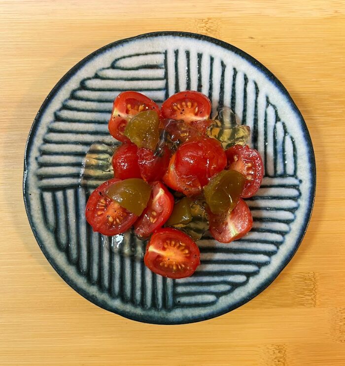 甘みのあるトマトに梅のゼリーを添えた爽やかな箸休め。脂っこい料理の合間にさっぱりと味覚をリセットしてくれます。