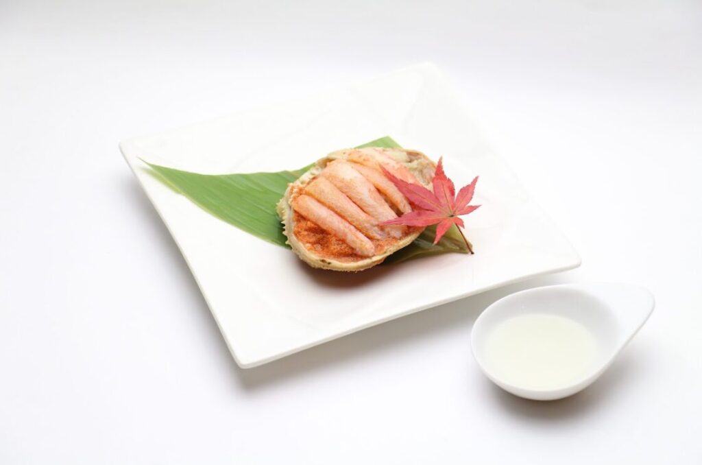 越前を代表するせいこ蟹を甲羅に盛った一皿。繊細な甘みの身と濃厚な蟹味噌を一緒に楽しめます。
