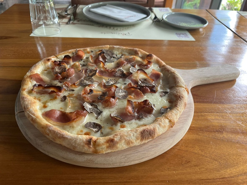 ▪️黒トリュフとグアンチャーレのピザ、トリュフを添えたマグロのカルパッチョ、手打ちタリオリーニのバターソース