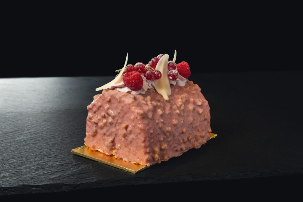 濃厚なチョコレートファッジスポンジにグアナハ70%ダークチョコレートのクレーム、ミルクチョコレートにサクサクのヘーゼルナッツフイユティーヌ、そして爽やかなラズベリーグレーズを組み合わせた、どんなお祝いにもぴったりの人気の一品です。