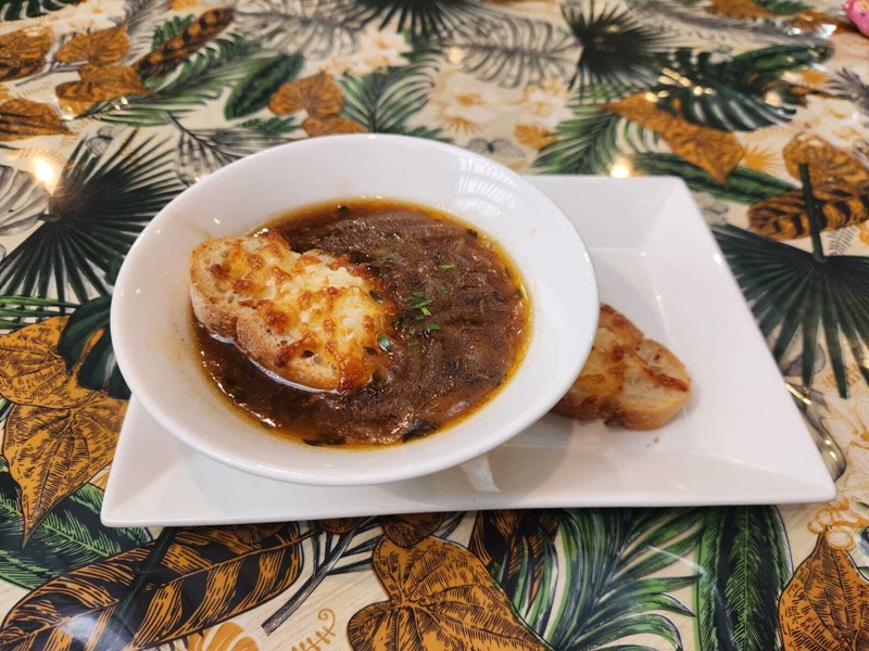 香ばしくキャラメリゼした玉ねぎを旨味たっぷりのブロスで煮込み、バゲットと溶けたチーズをのせた一品。
