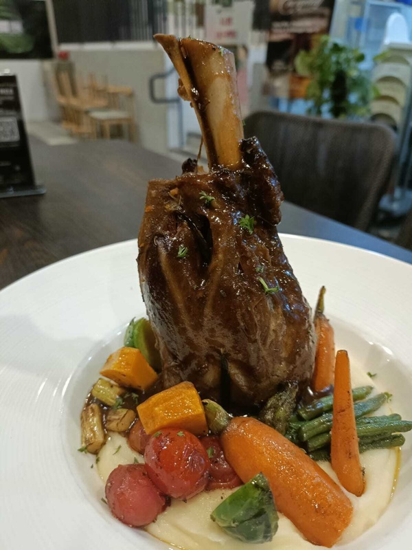 シェフ特製の旨味ソースでゆっくり煮込み、マッシュポテト、季節の野菜、冬のフルーツを添えて。