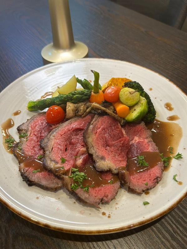 じっくりローストしたリブアイを、赤ワインソースとベビーポテト、季節の野菜とともにご提供。