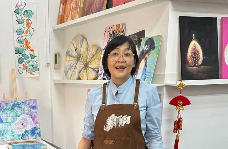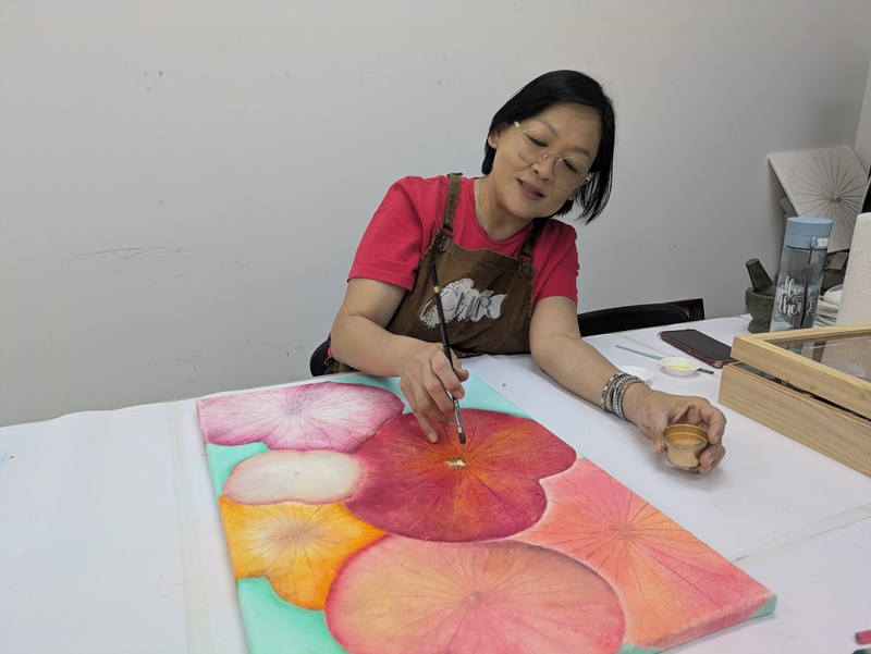 インストラクターの Cher SEK さん は、バンコクでロータスリーフアートの創始者である Catherine Cajean に師事し、技術を身につけたアーティストです。バンコク滞在中には 漆(lacquer)アート にも取り組み、自身の作品を制作。常に新しい技法を取り入れながら、アートに向き合っていらっしゃいます