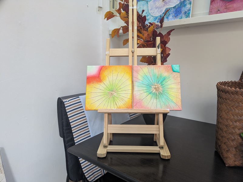 ロータスリーフアートは、飾りたい場所に合わせて、ポップな色合いにするのか、落ち着いたトーンでまとめるのかを自分で選べるので、思い描いた通りのインテリアアートを作れるのもこのスタジオの魅力です。また、上級者は、ロータスリーフの配置やサイズの組み合わせなども楽しめるそうです。