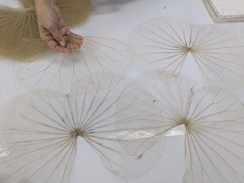 ロータスリーフはすべてタイから取り寄せていて、大きさも表情もさまざまです。葉そのものを乾燥させた「ドライリーフ」と、葉脈だけを残した「スケルトン」タイプから選ぶことができ、ペイントしたときの仕上がりの表情も変わります。