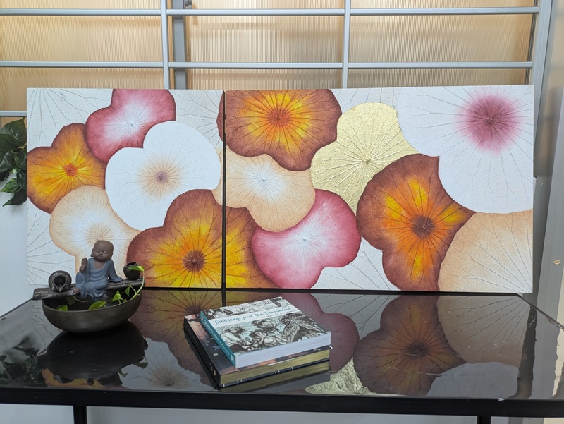 ロータスリーフアートとは、本物の蓮の葉をキャンバスに貼り、色を重ねて仕上げるアート作品。アートパネルとして、お部屋や玄関、リビングのアクセントになる、自分好みのオンリーワンの一枚を作ることができます。