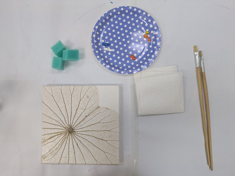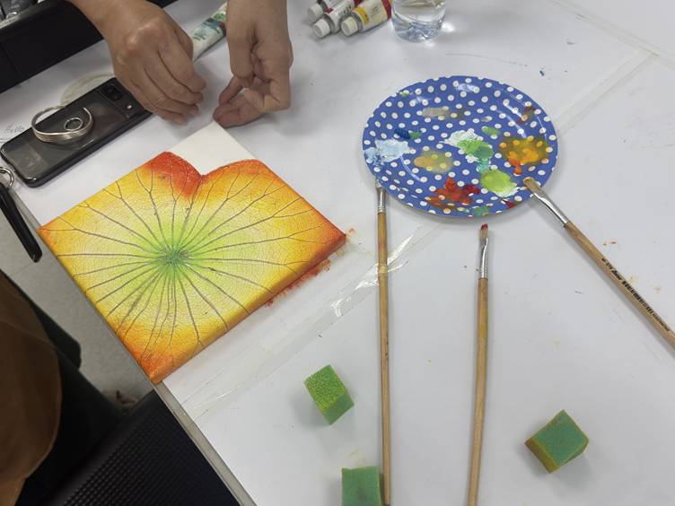 初めての方におすすめされているのは、40cm × 40cm のスクエア作品。大きすぎず小さすぎず、蓮の葉の表情をしっかり楽しむことができ、色の重なりやグラデーション作りもゆっくり試せるそうです。休憩も含めた4時間のレッスンで、無理なく完成までたどり着ける、初心者にちょうどいいサイズです。