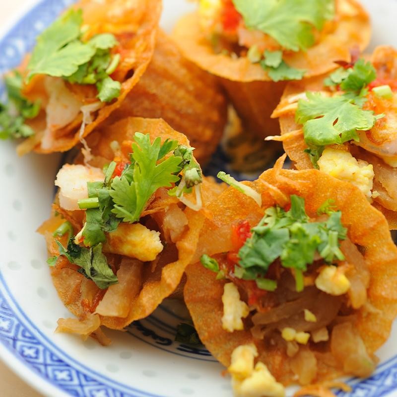 ニョニャ料理の中でも人気な前菜「Pie Tee(パイ ティー)」。カップ状にあげられた皮に、海老や野菜、卵焼きなどが入っており、お好みでチリソースをつけて食べます。癖がなく食べやすい料理の一つです。
