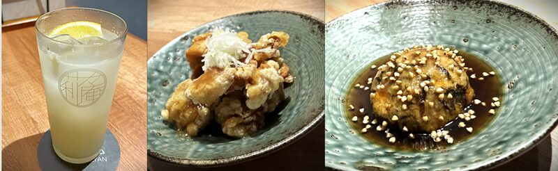 左)「莉々庵レモンサワー」S$15、(中)「黒酢あん 若鶏竜田揚げ」S$21、(右)「とろとろ蓮根まんじゅう」S$16