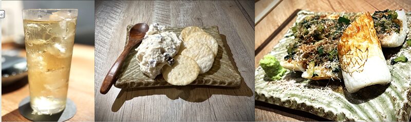 (左)韃靼そば割りS$12、(中)いぶりがっこチーズS$16、(右)鯛ちくわの”板わさ”S$17