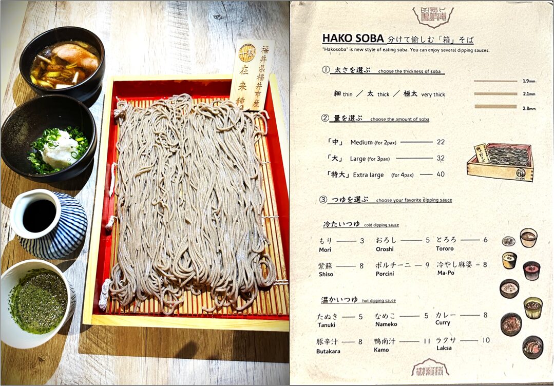 (左)上から「鴨南汁」つゆS$11、「おろし」つゆS$5、「紫蘇」つゆS$8。分けて愉しむ「箱」そば・ 中/大/特大 S$22/32/40