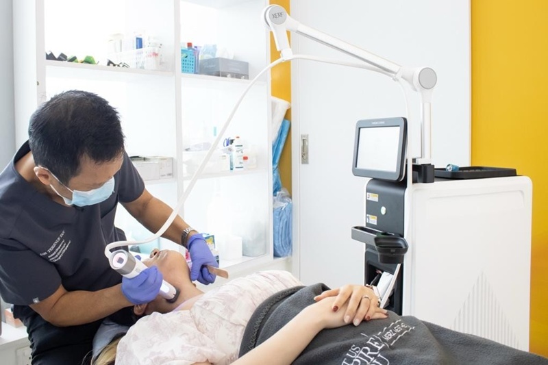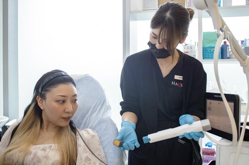 施術は温熱を用いた方法で行われ、急な刺激や強い負荷がかからないよう配慮されています。Dr. テレンス・タンが施術中の設定をこまめに確認・調整しながら実施します。