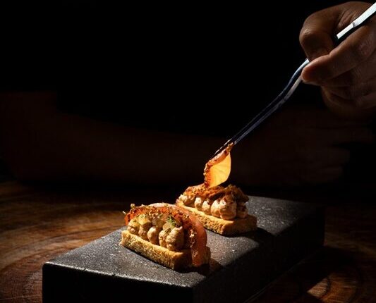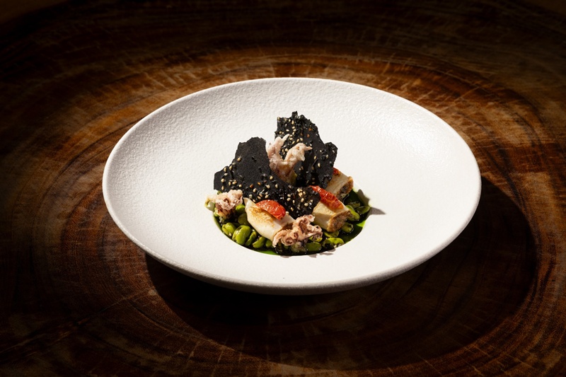 Crab and Avocado Bruschettaは、四川風のワカモレにザクロでさわやかさをプラス。仕上げに青リンゴのスライスとトンブリで食感の楽しさもアップしました。スパイシーさは控えめでスターターにぴったり。