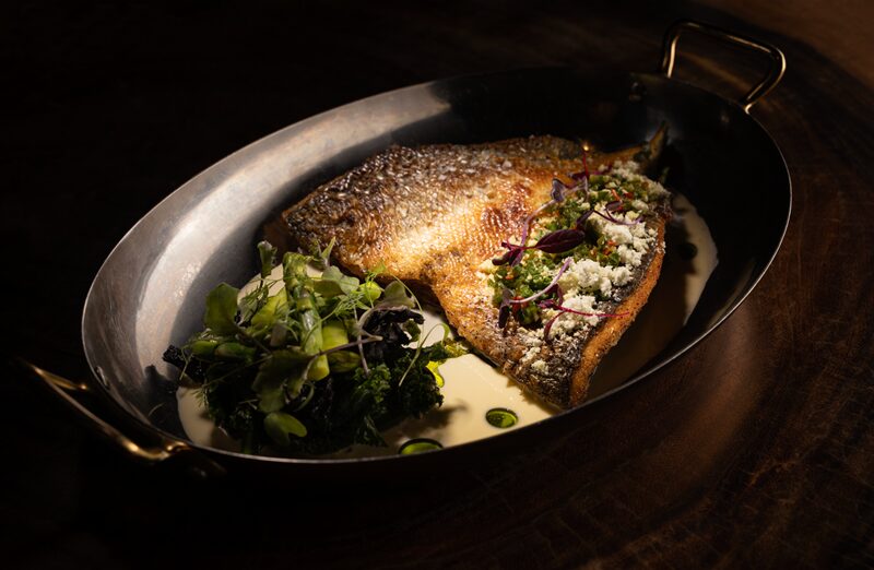 付け合わせにはアスパラガス、ラットポテト、ケール、そしてブラックトランペットマッシュルームを使用。 ソースは、ヴァンペッパーをほのかに効かせたクラシックなフランスの白いバターソース「ヴァンペッパー ブールブラン」でいただきます。骨は取り除かれているため、見た目の豪華さとは裏腹に食べやすい一皿です。