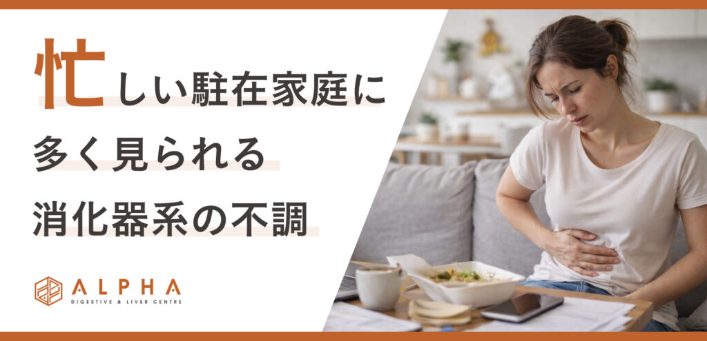食事の選択肢の違い、外食の増加、不規則な食事時間、仕事や家庭での責任の増加などは、いずれも消化器官に負担をかける要因となります。さらに、駐在家庭では東南アジア地域への旅行も頻繁であり、これが消化器の健康に影響を与えることもあります。