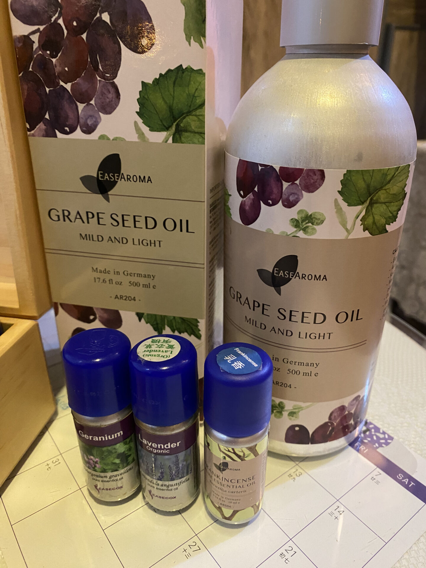 カウンセリングを通じて肌タイプやその時の悩みに応じたアロマオイルを選びます。こちらで使用するアロマオイルはドイツ製「EASEAROMA」のものを中心にイギリスやフランスからお取り寄せ。ラベンダーなど、いろいろなお花の種類がありますが、オーガニックもそうでないものも含め全て、高品質の物が取れる特産地から選ばれたものを使用して作られています。