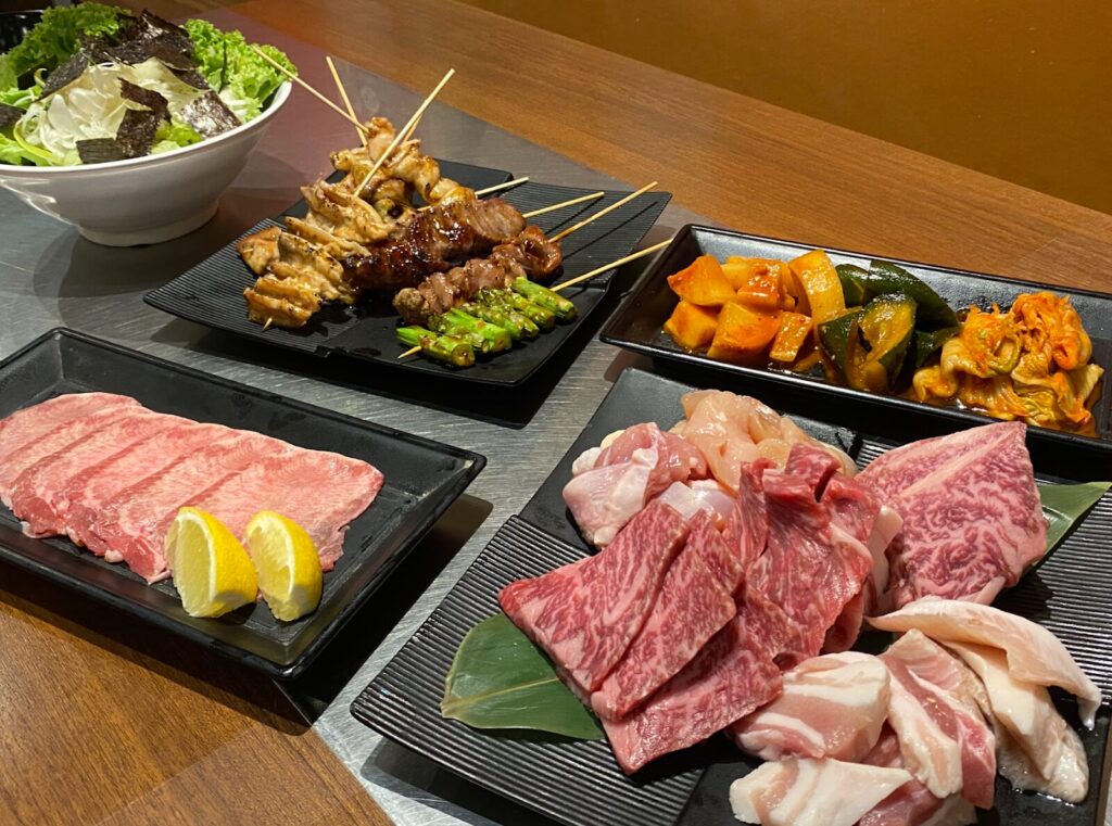 ※A4和牛など焼肉メニューとサラダ、お刺身、一品料理、ご飯系、麺類などのサイドメニューも食べ放題