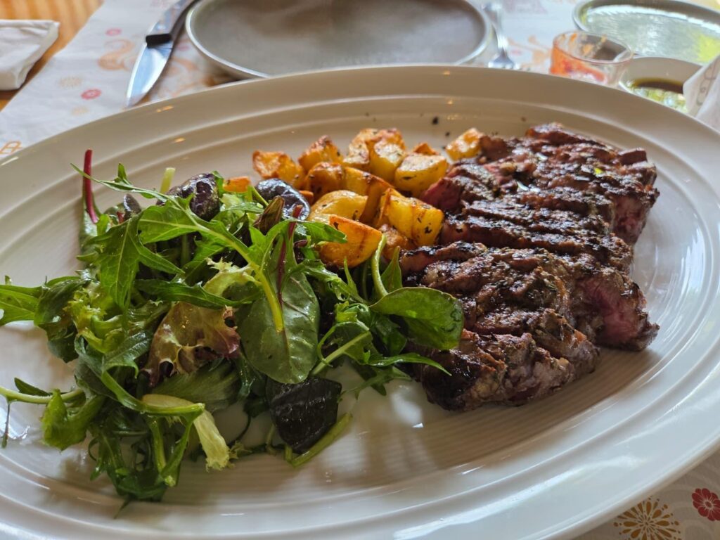 和牛リブアイ(霜降り度4/5)500gのグリル。ローストポテトとグリーンサラダ添え