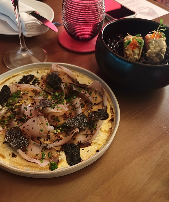 シーバスのクルードは、新鮮なスズキをオリーブオイルやレモンで味付け。