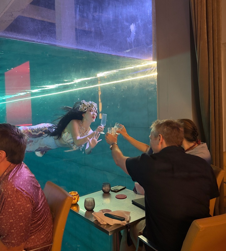 オリンピックサイズのプールがあった場所がMRTの開通に伴い撤去されましたが、それを惜しんだオーナーが、歴史に敬意を表して、オリンピックサイズのダイビングプールを備えたバーを作りました。ここはシンガポールで唯一、プロのマーメイドのパフォーマンスを見ることができる、「人魚姫の世界」を体感できるバーです。