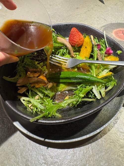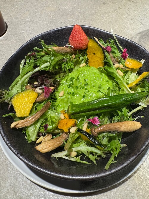 さまざまなグリーンと中央には豆のペーストがどんと鎮座。その上にしめじやいちご、パンプキンなどの自家製フリーズドライの野菜や果物が、色味とサクサク食感で楽しさを添えています。胡麻ドレッシングをかけると、よりおいしくなります。