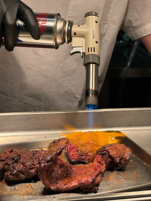 仕上げに自家製ケイジャンスパイスを振ってバーナーで炙ると、香りが上がり、美しい焦げ目がつきました。