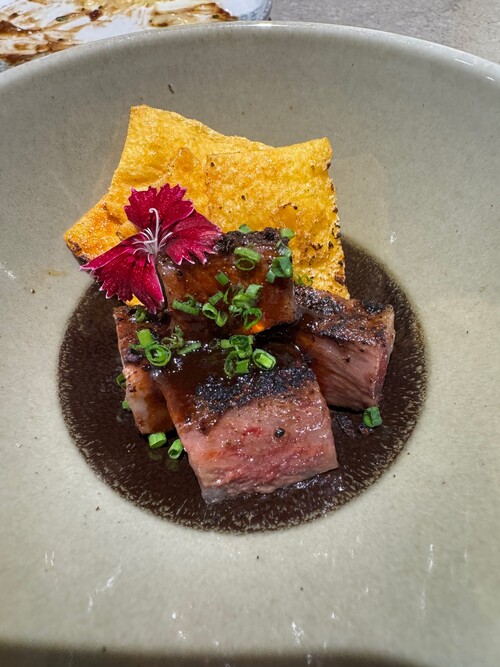 表面を焦げるほど焼いたステーキ。最初のビーフコンソメより、もっと濃厚なソースをかけた肉はカリッとしたチップスと一緒に食べるのがおすすめ。このとうもろこしのチップスの軽い食感は、おやつとして食べたいくらいです。こちらのお肉には程よくサシが入っており、脂の旨みがあります。