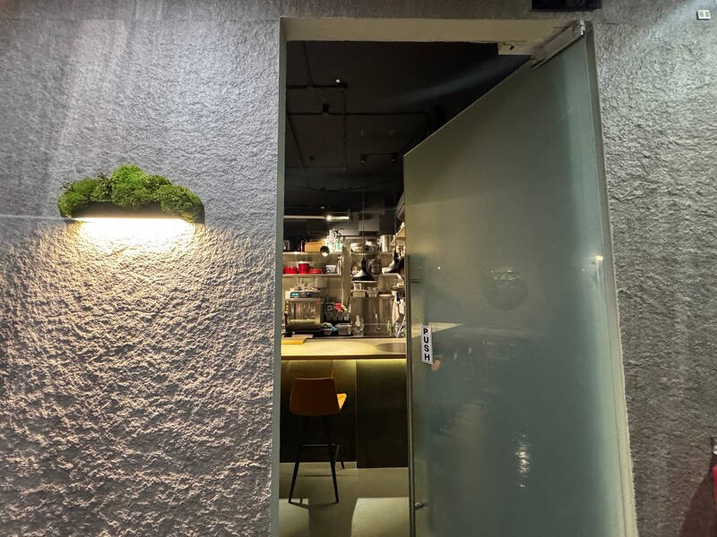 実はプライベートルームと精肉店ダイニングは直接つながっていません。サイドのドアから出て、少し進むとベージュのライトが見えます。店名などはなく、まさに隠れ家。