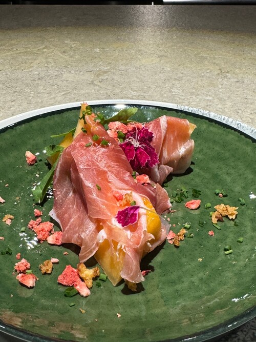 まずは前菜としてロックメロンとたっぷりのパルマハム。美しく散らしたのはフリーズドライのいちごや食用花。愛らしい赤い雨がメロンとハムに降り注いでいます。味はハムの塩気とメロンのほのかな甘味がマッチ。定番の味ながら、ハムがおいしいです。