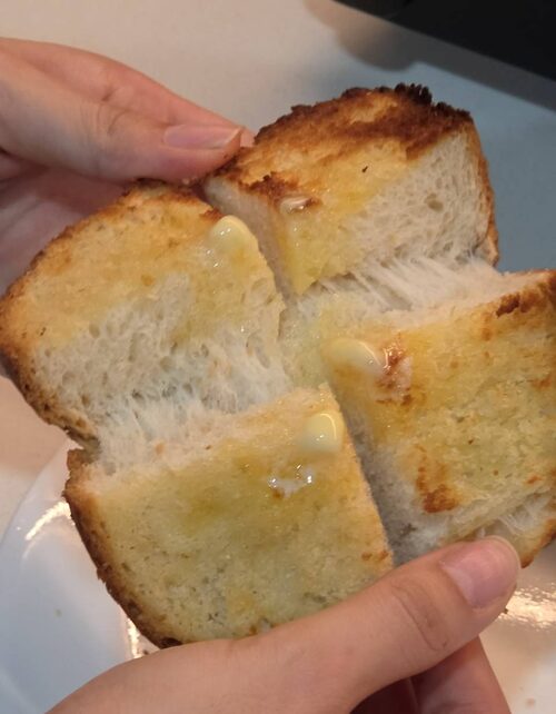 実際に食パンを焼いてみると、その違いはすぐに分かりました。表面はこんがりと焼き色がつき、軽くサクッとした食感。