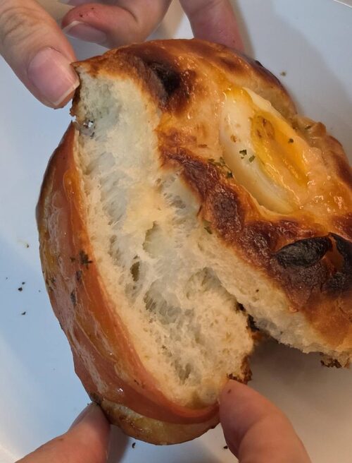 今回一番興味深かったのは、ハムと卵がのったパンです。通常、具材が多いパンは、上の具材を温めるために強くするとパンがパサパサになってしまうことがあります。