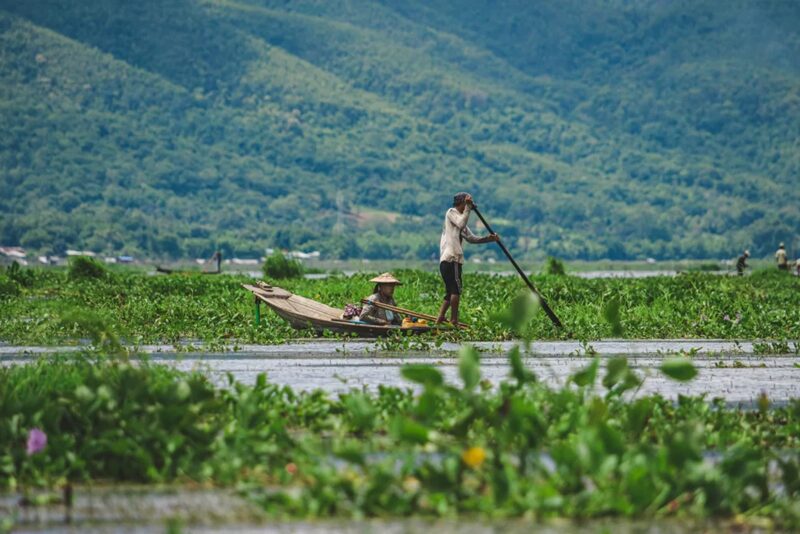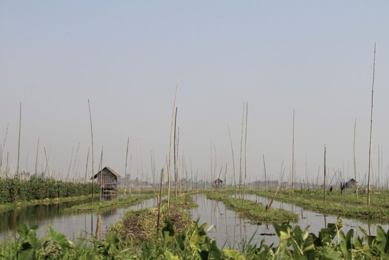 観光名所のひとつになっているインレー湖では、水上でトマトを栽培していました。植物が直接水分を吸収するので水をあげる必要もなく、また野外での栽培なので温度調節もいらないのだとか。省エネ栽培を間近で見ることができました。