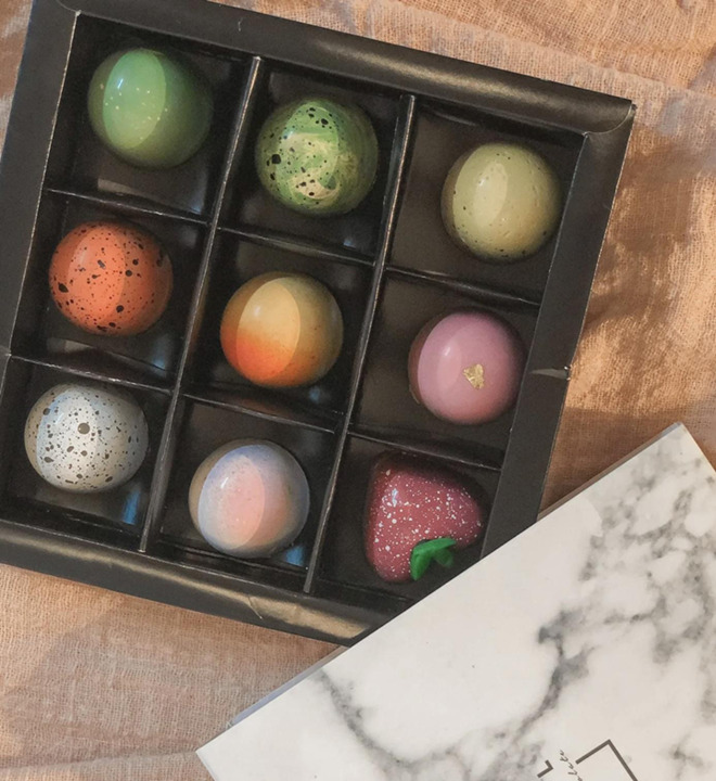 世界中のカカオ農家や信頼できるカカオエージェントから高品質の豆を調達しています。そして、手作業で丁寧に選別からグラインドまで行い、それぞれをユニークなおいしいチョコレートに仕上げていきます。Bonbon Box of 6(S$24)は、愛らしくおいしいボンボンです。喜ばれること間違いなし!