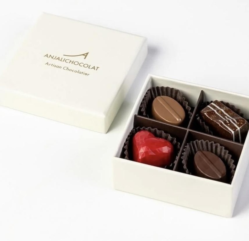 Anjali Chocolatでは、ベルギー産クーベルチュールなど、最高級の素材を使用して、丁寧に作っています。Gift Box of 4 Chocolate Bonbons: Classic Collection(S$16)は手作りのボンボンショコラ4個入り。ノワール、ラベンダー、塩キャラメル、ラズベリーなど、定番フレーバーのアソートです。クリーム色の箱入りです。