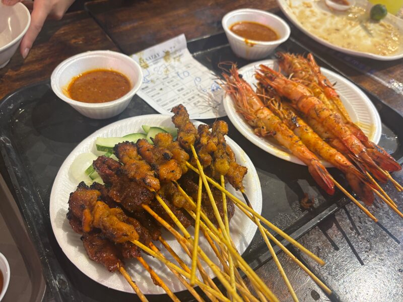 屋台料理の定番である串焼き料理。サテーはアラブ発祥の料理でチキン、ビーフ、マトンの肉を、タマリンドやガランガルなどのスパイスを混ぜた香辛料をつけて、炭火の上で焼きます。