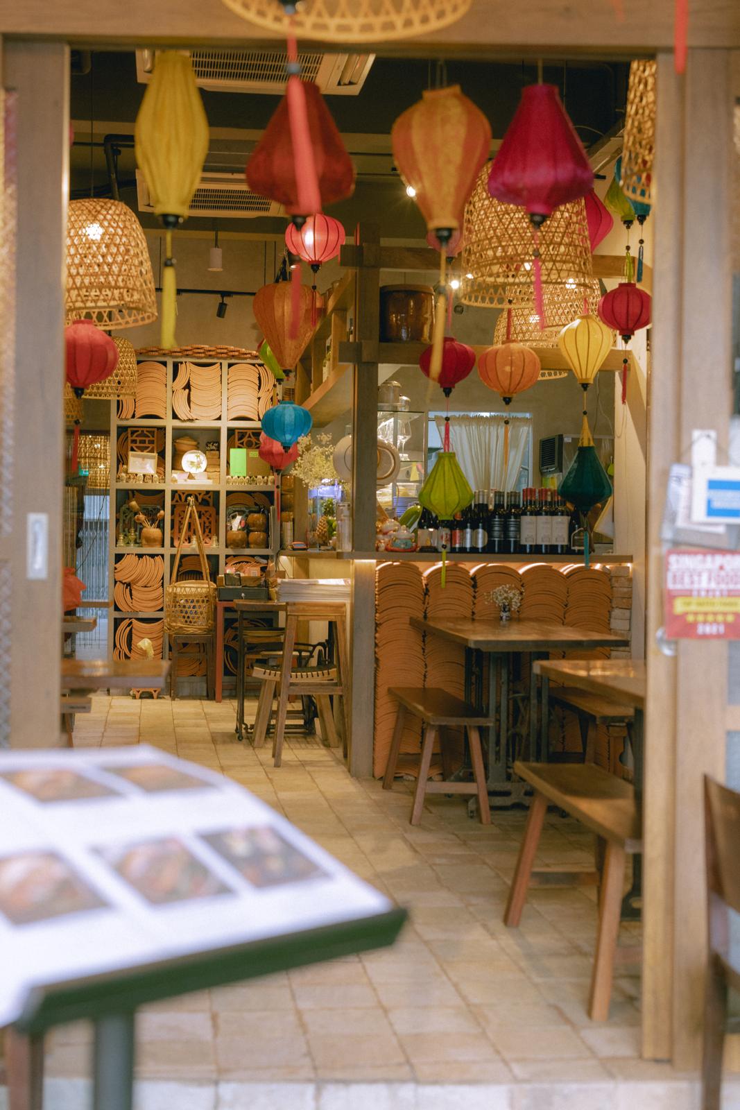 店内は1980年代のベトナムを感じさせる落ち着いた雰囲気で、伝統的な装飾やランタンが異国情緒を演出。屋外席もあり、シンガポールの風を感じながら食事を楽しむこともできます。